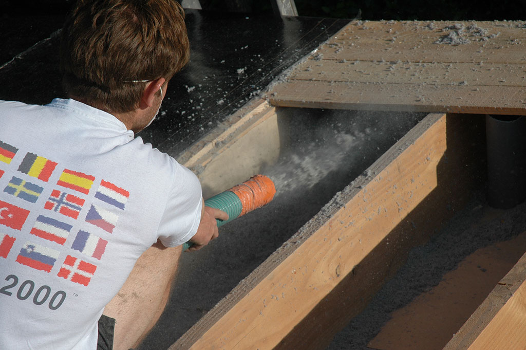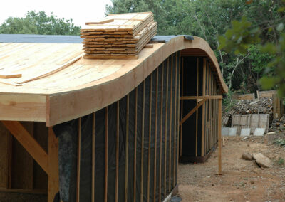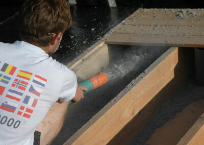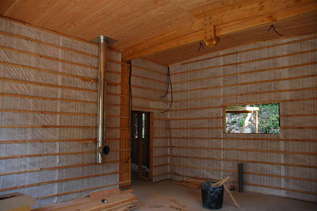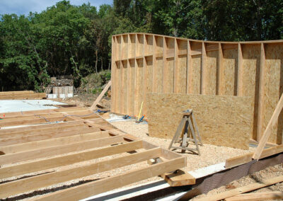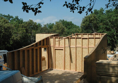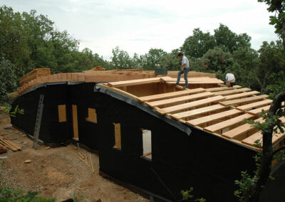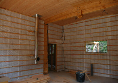 Isolation en ouate de cellulose soufflée pour la toiture (25cm) et injectée pour les murs (15cm). Réalisation & pose de « précadres » (encadrements de fenêtres en Douglas raboté avec appui de fenêtre plaqué alu) pour les fenêtres et les portes alu choisies par le propriétaire. Les façades seront recouvertes par le propriétaire en clins de Red Cedar.