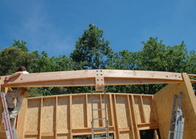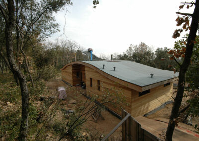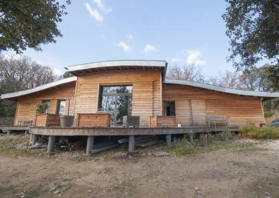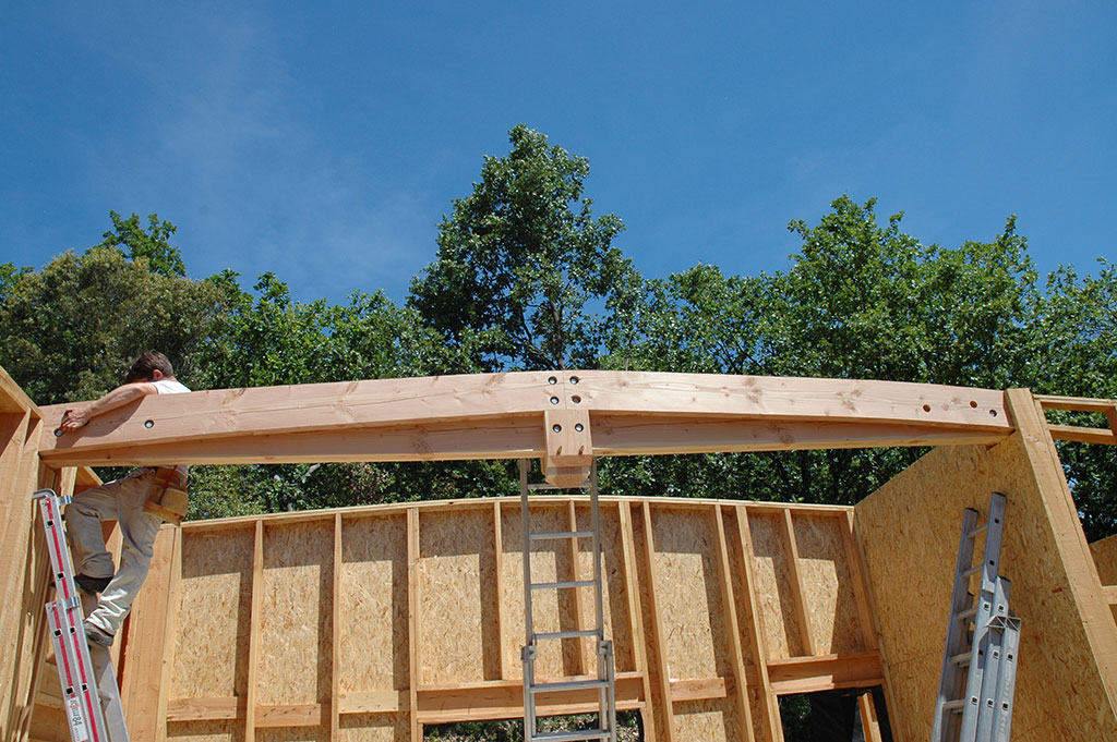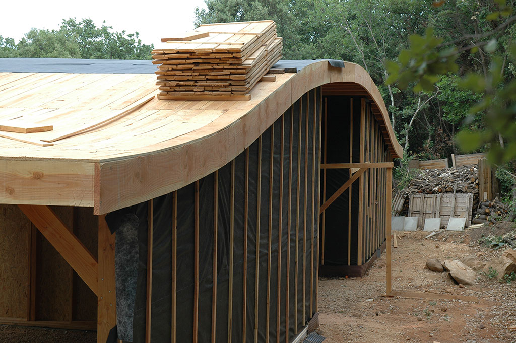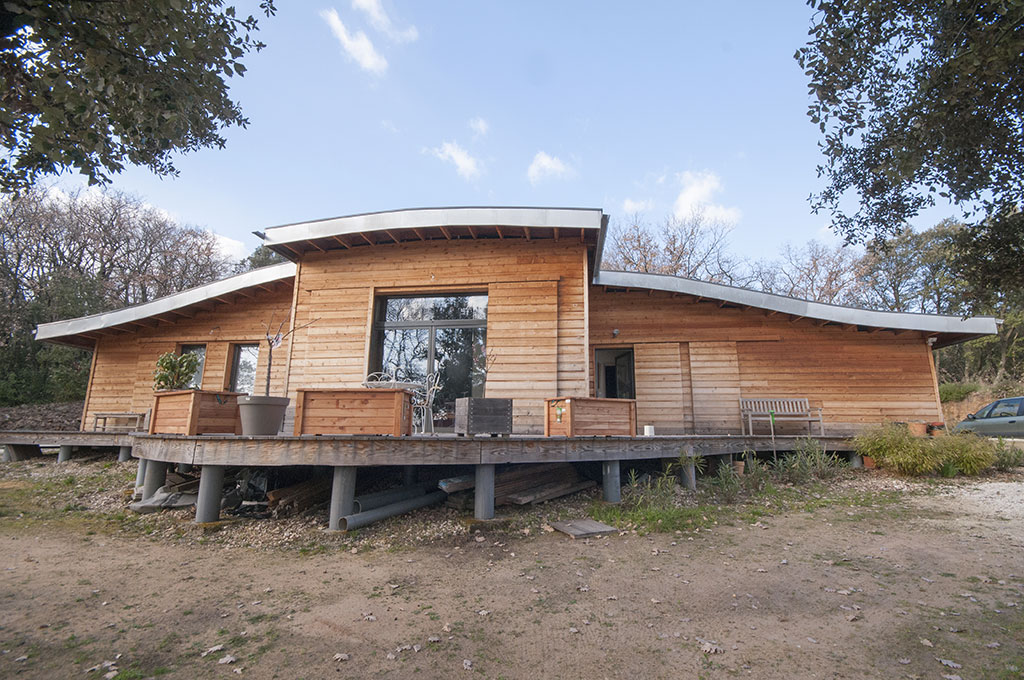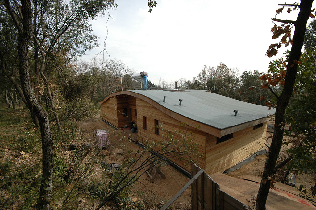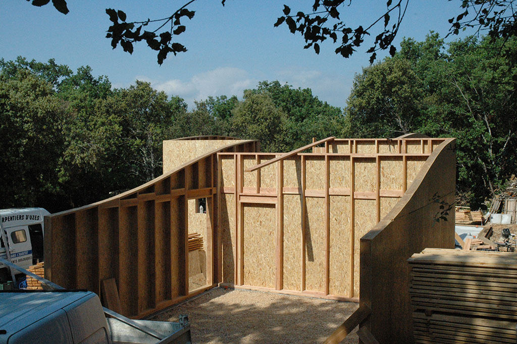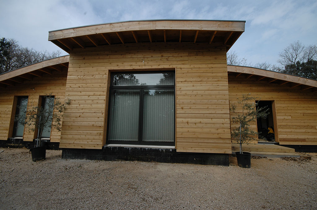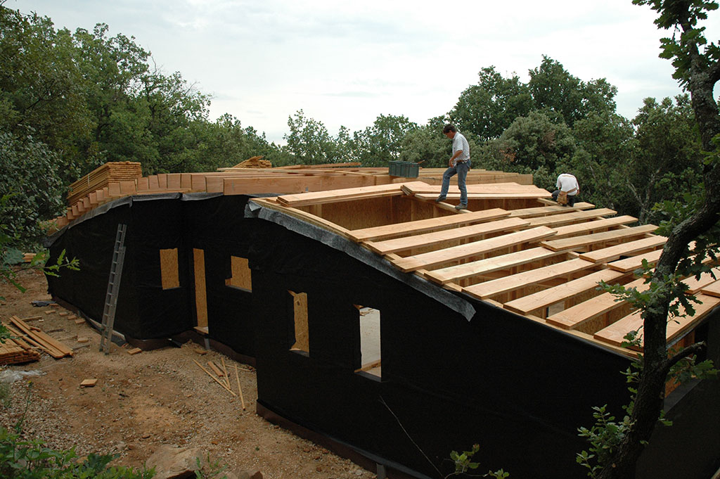 Le chantier a débuté le 2 mai, et s’est achevé le 23 juin avec la réception de la maison par le client. La construction des murs a pris moins d’un mois, il en est de même pour la très belle toiture en forme de «vague». Le bois employé est du Douglas traité lors de la pose au sel de bore.