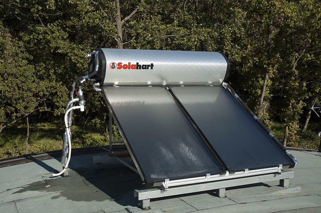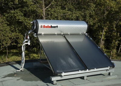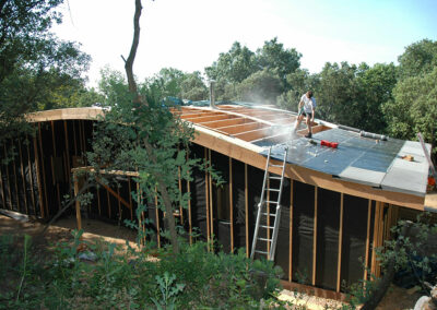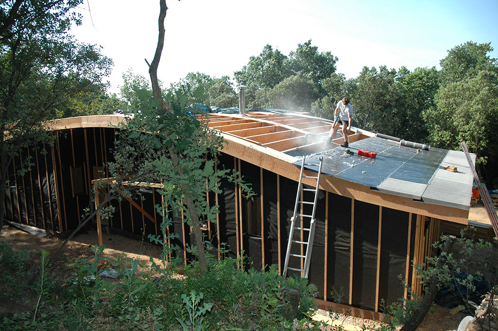 La toiture sera couverte par le propriétaire d’une membrane d’étanchéité (c’est son métier). Elle recevra un capteur solaire de 4 m² pour l’eau sanitaire.