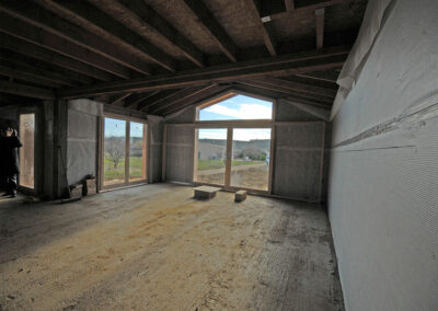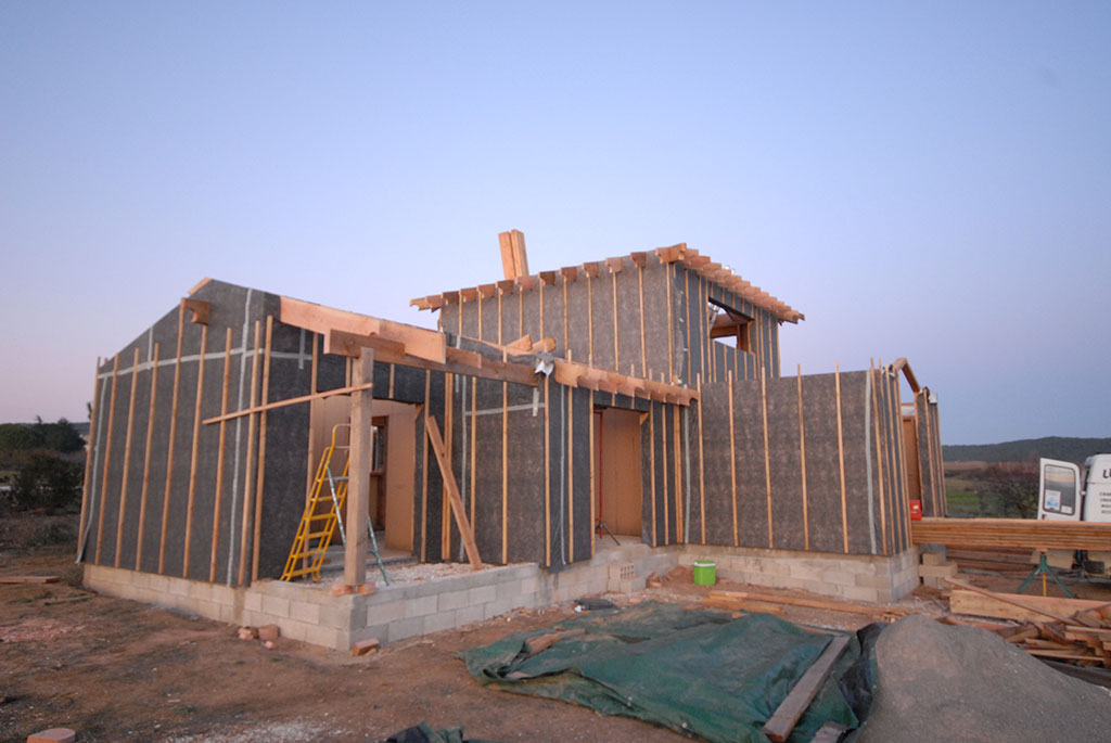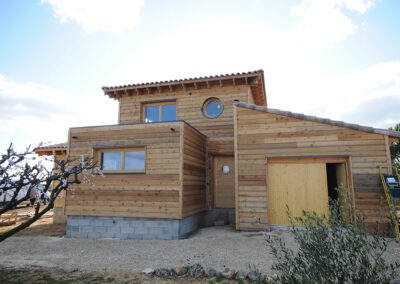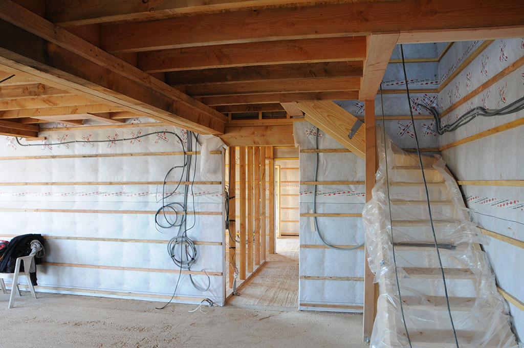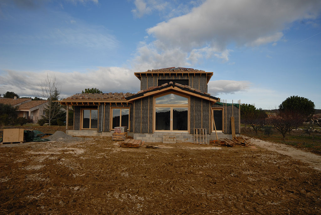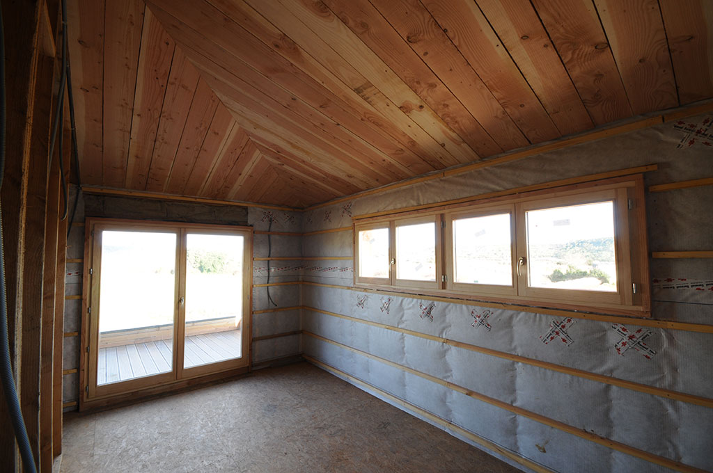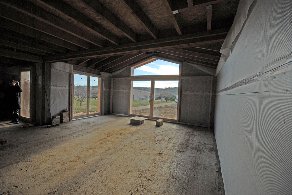 L’ensemble est réalisé comme d’habitude sur une dalle à inertie, pour un confort d’été maximum, et les murs voient leur isolation renforcée par une couche de fibre de bois de 4 cm ce qui porte l’épaisseur totale à 19 cms.